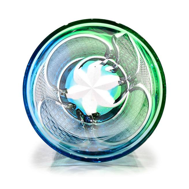 宙吹きとは、熔解炉で高温に熱せられた硝子を吹き竿の先に巻き取り、職人が直接息を吹き込むことにより中空成型していく技法です。型を使用しないため、それぞれ形の異なるものが出来上がります。華硝では、個々の宙吹き硝子の特徴を見極めた上で、その形状に最適な独特の紋様を施すことにより、世界でたった一つの芸術性の高い江戸切子として仕上げていきます。