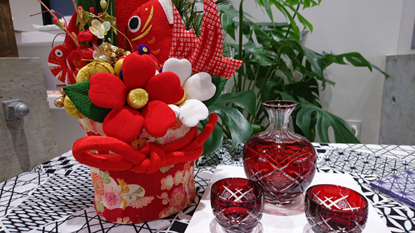 紅白にちなんだ華やかな新作の江戸切子や、